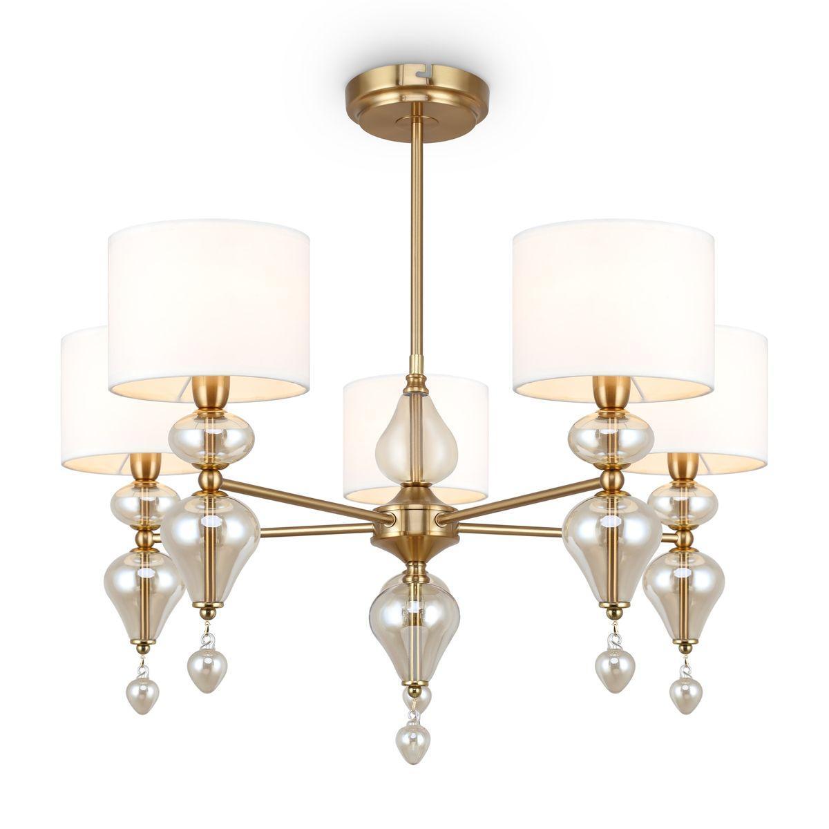 Подвесная люстра Freya Raise FR5369CL-05BS — пятирожковая модель с латунной арматурой и пятью белыми тканевыми абажурами.
