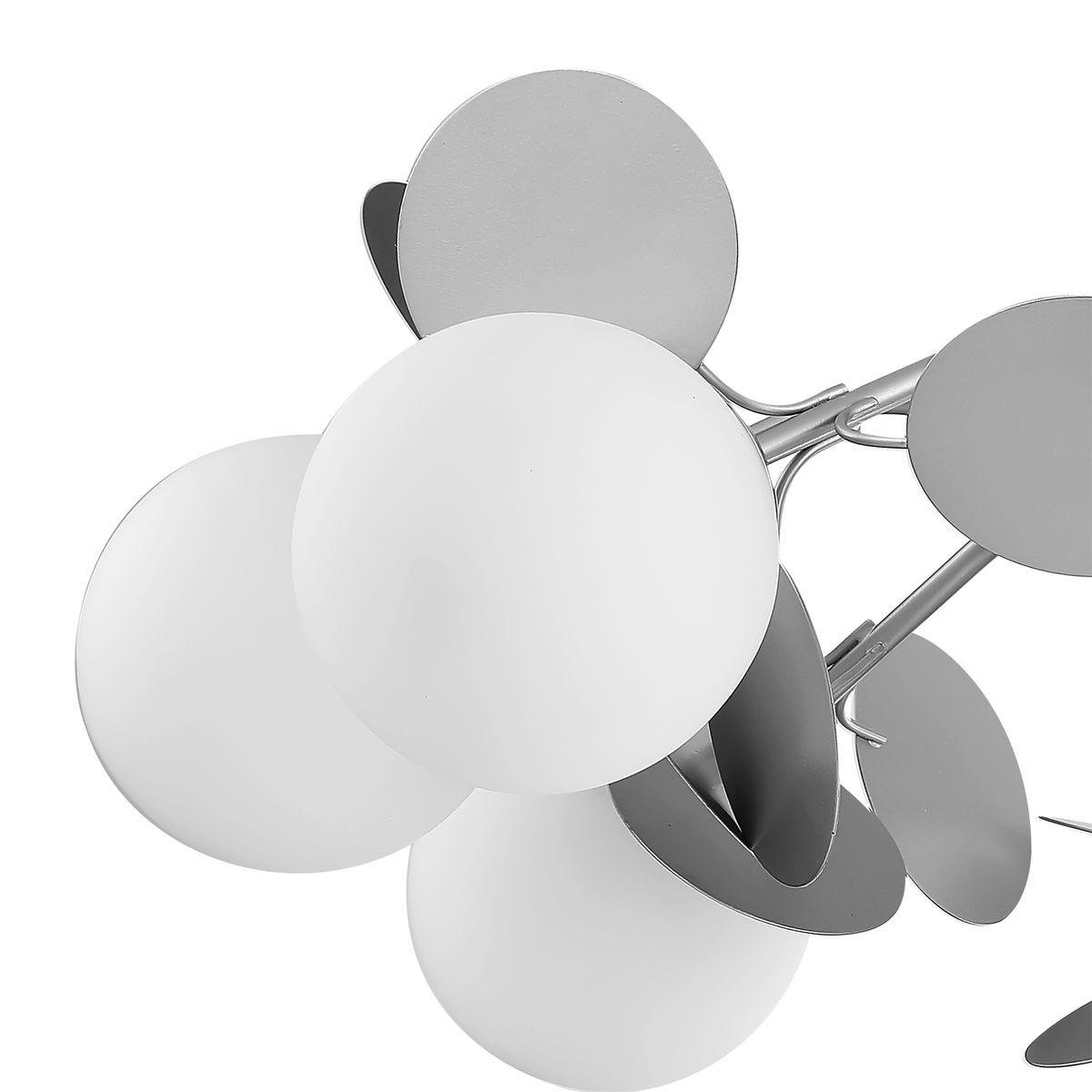 Потолочная люстра Freya Satellite FR5165PL-06S — модель в стиле хай-тек с серебристой арматурой и шестью белыми стеклянными плафонами.