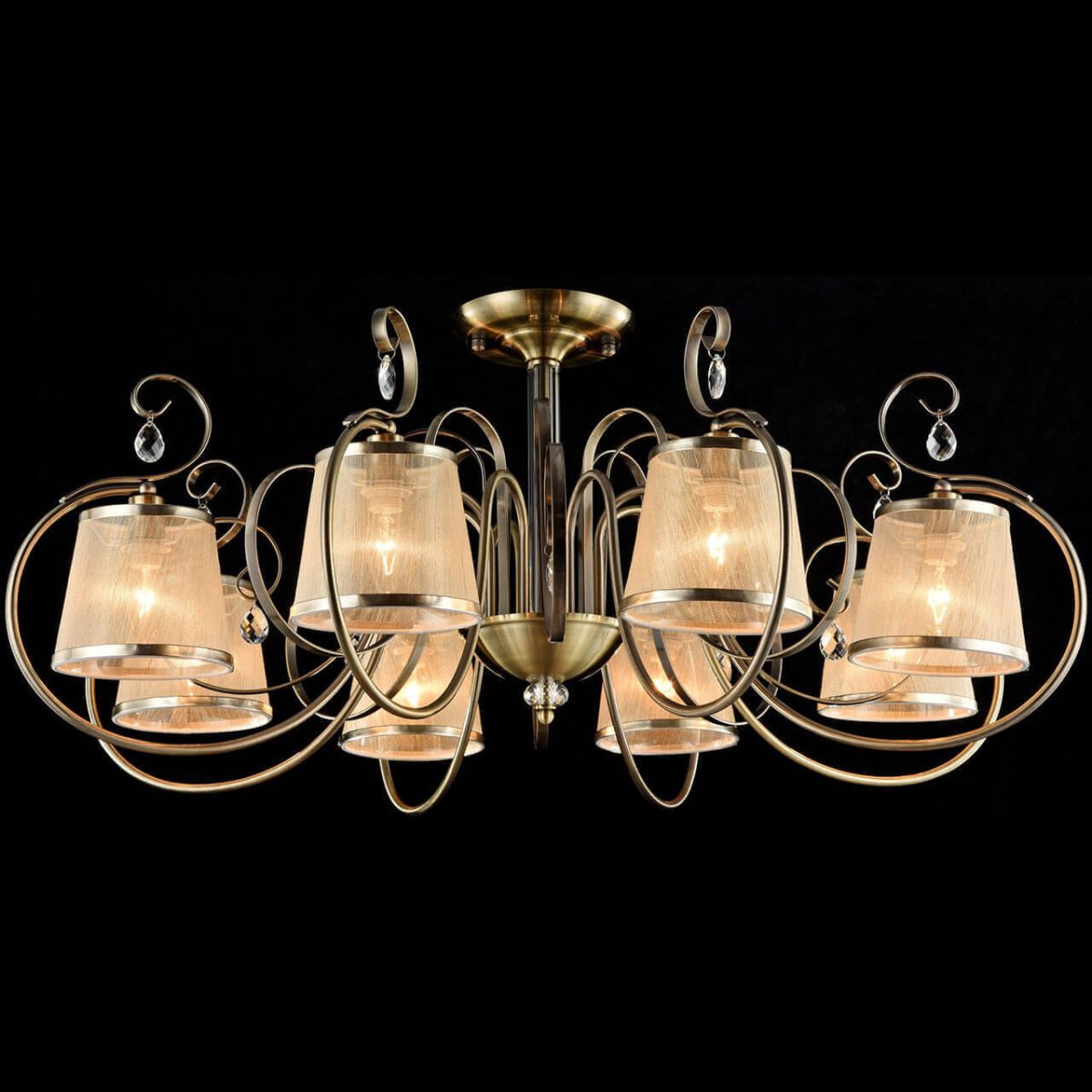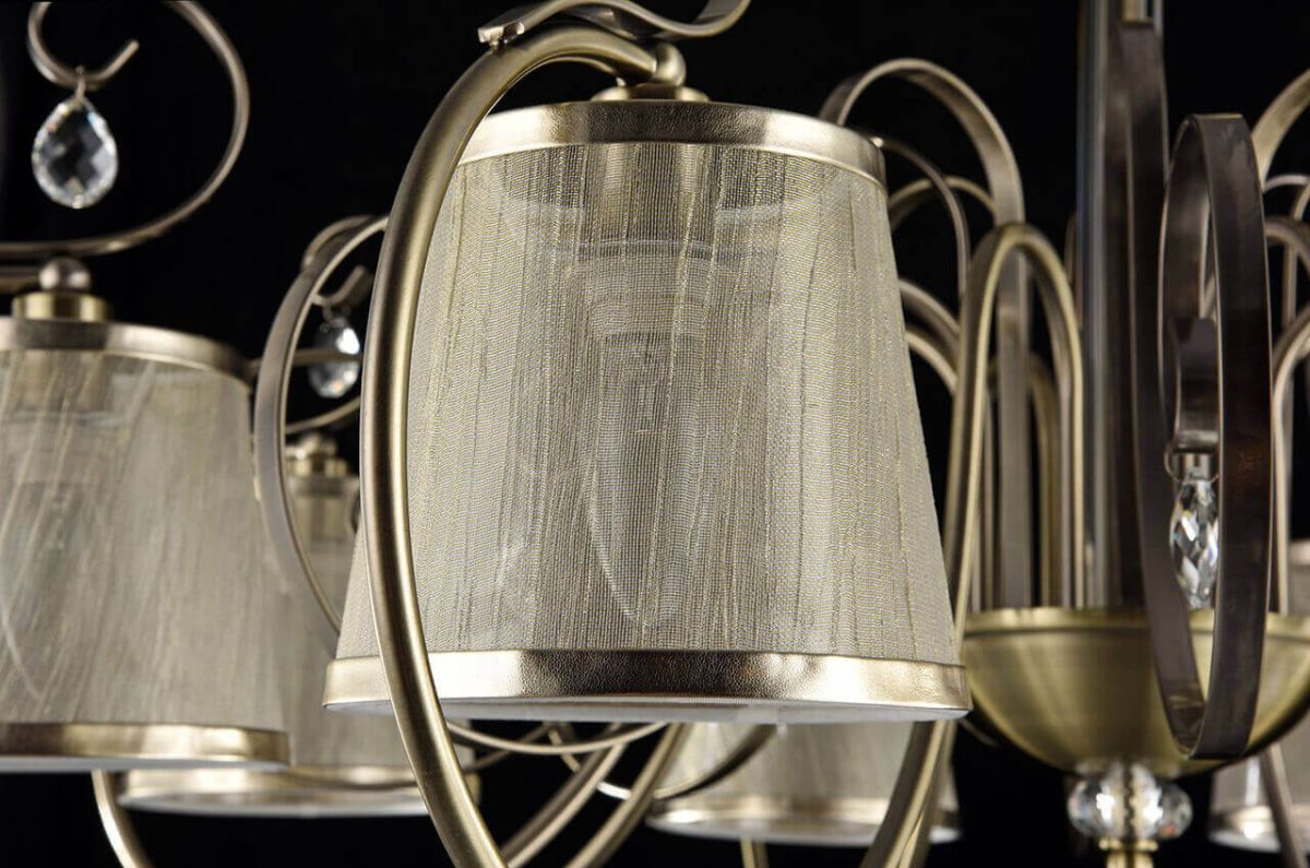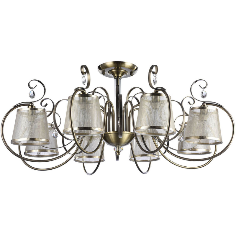 Потолочная люстра Freya Simone FR2020-CL-08-BZ — модель в стиле арт-деко с бронзовой арматурой и восемью бежевыми тканевыми абажурами.